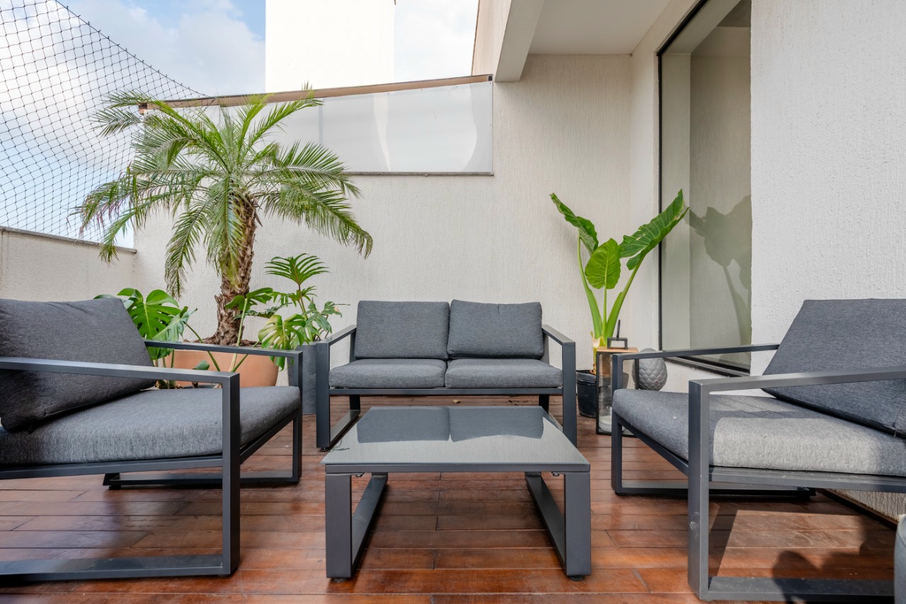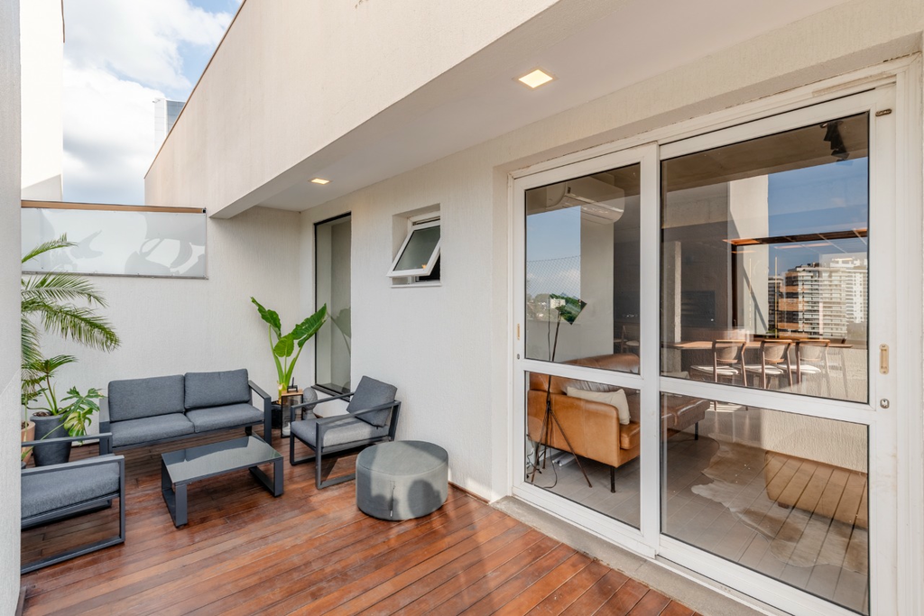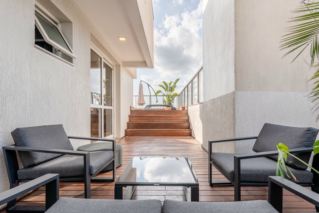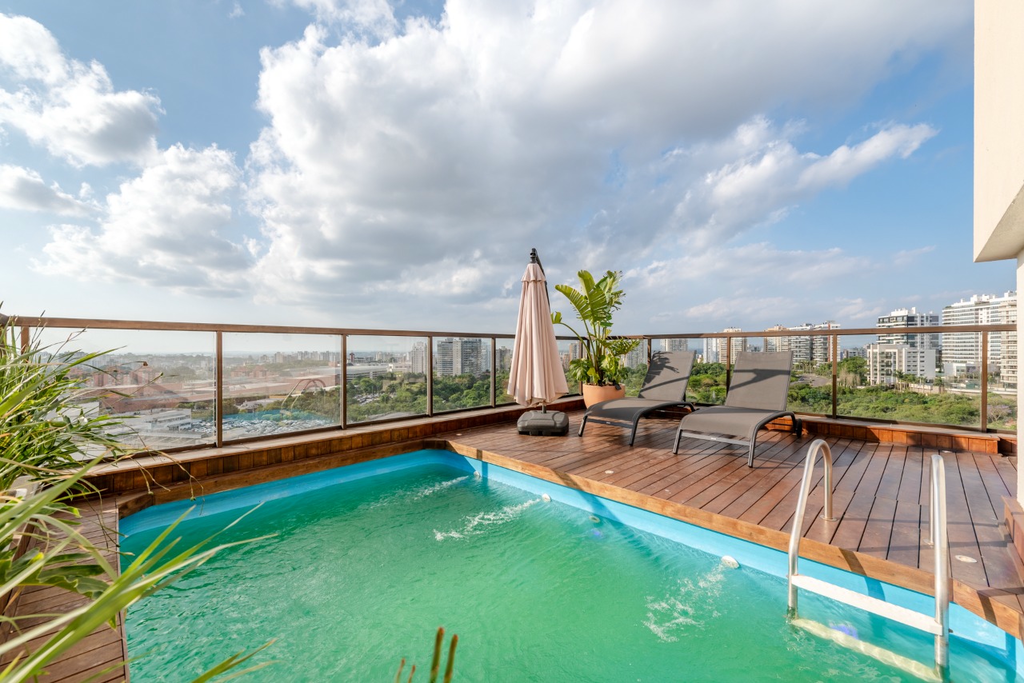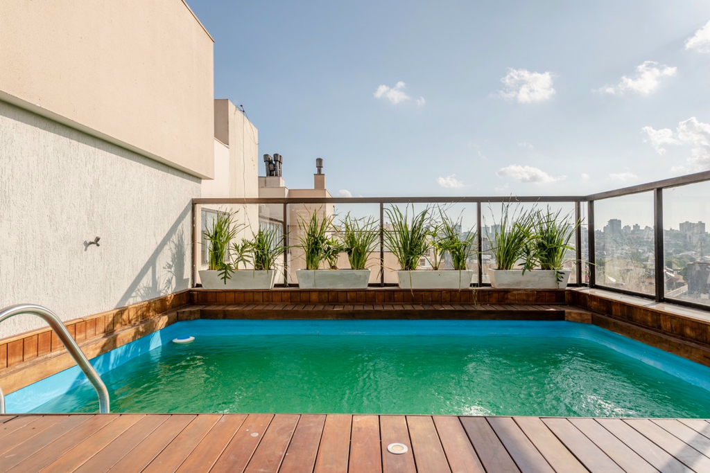 Ao ar livre, o deck integra uma área de convívio e piscina, que recebe sol o dia todo, com vistas de tirar o fôlego para o Jardim Europa.