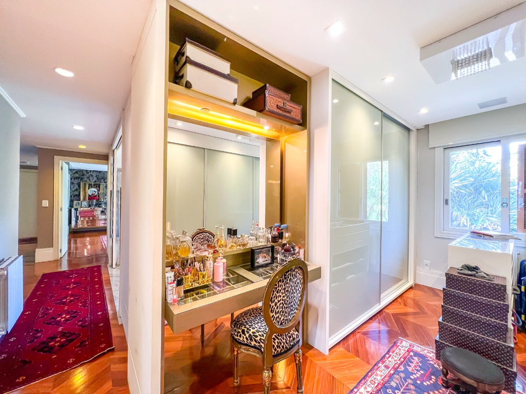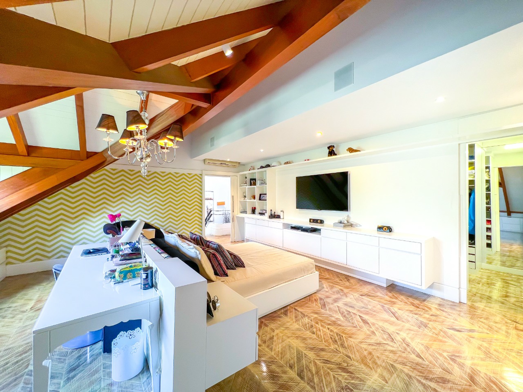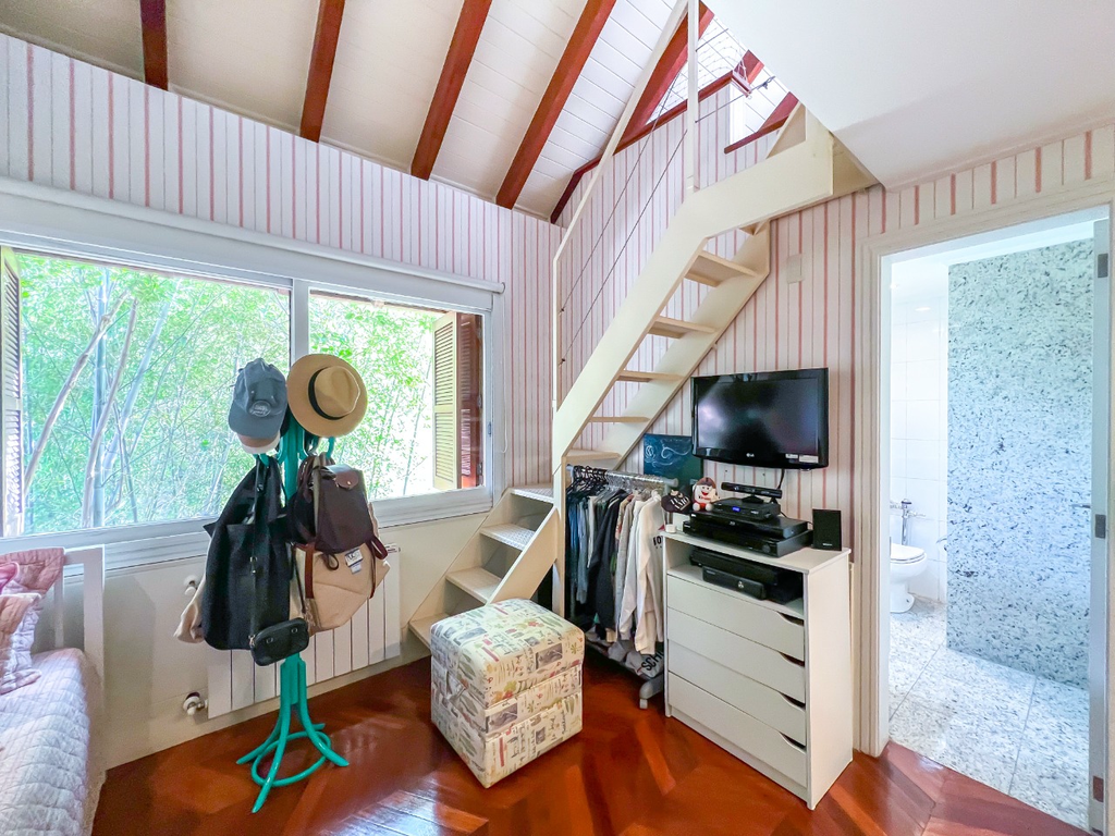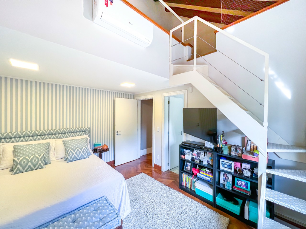No segundo andar, uma ampla suíte decorada com requinte abriga closet, bancada de estudos e penteadeira, acompanhada de um ambiente adicional que pode servir como dormitório de hóspedes ou espaço multifuncional, além de um banheiro social.