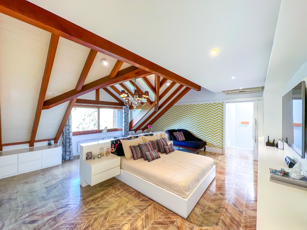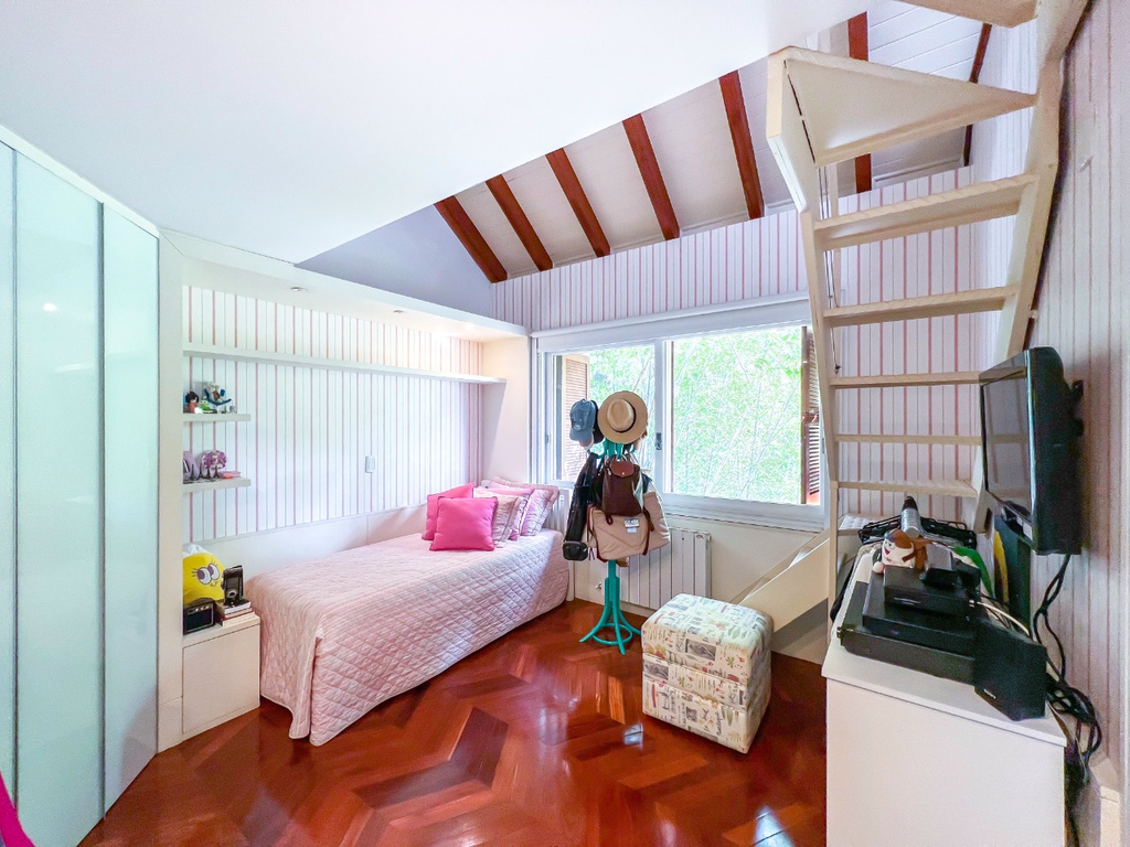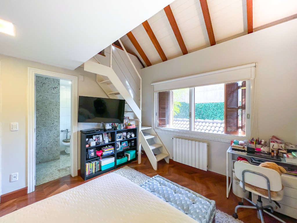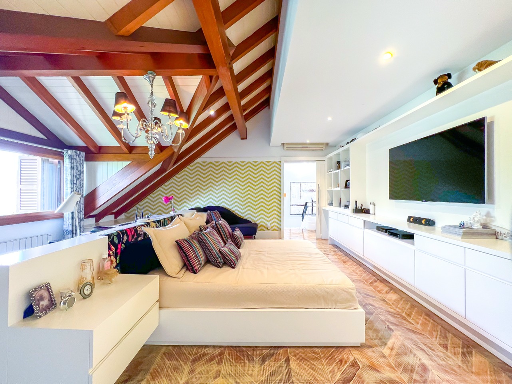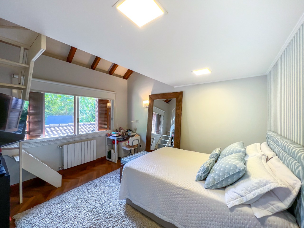 No segundo andar, uma ampla suíte decorada com requinte abriga closet, bancada de estudos e penteadeira, acompanhada de um ambiente adicional que pode servir como dormitório de hóspedes ou espaço multifuncional, além de um banheiro social.