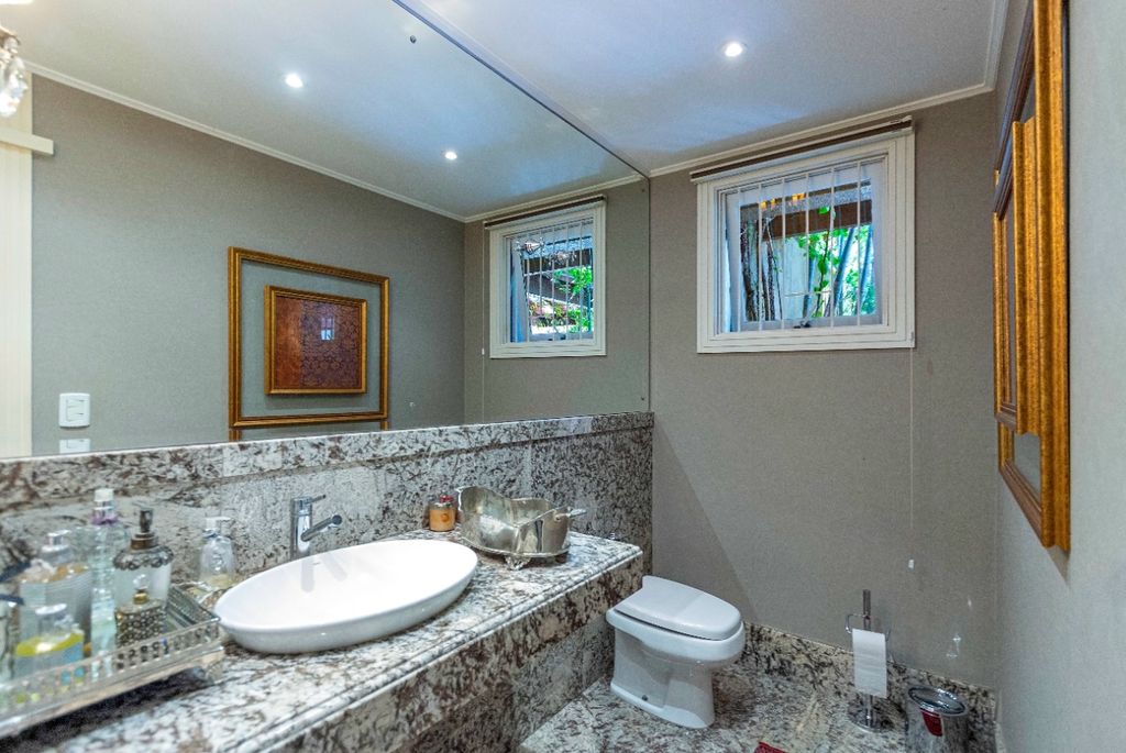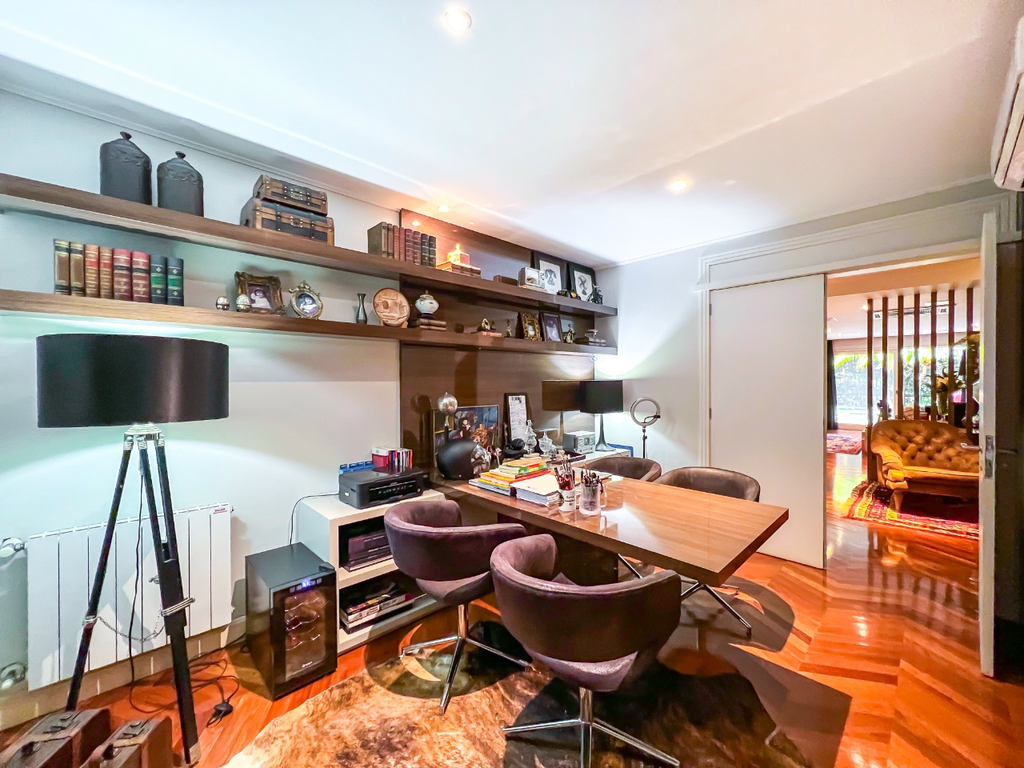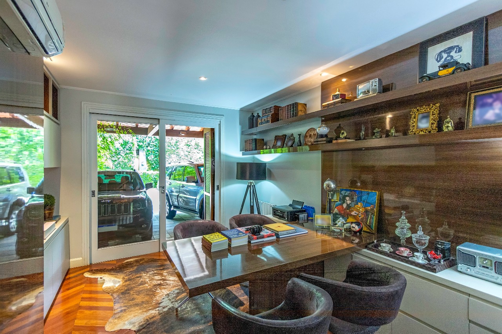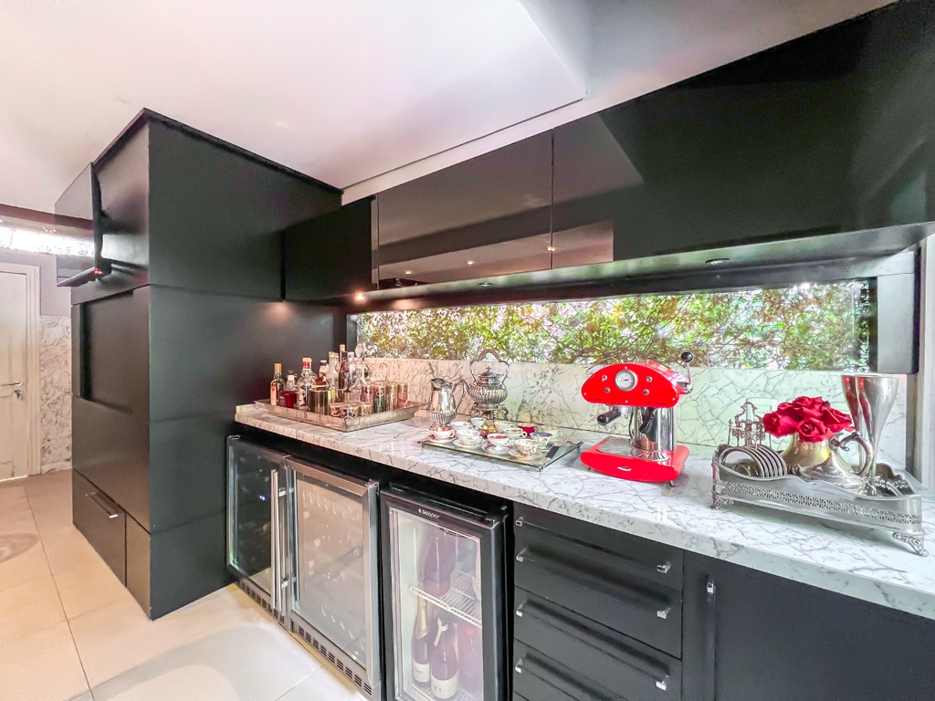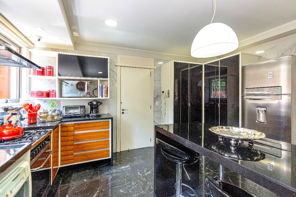 Ainda neste nível, encontram-se um lavabo, um escritório, a cozinha equipada com móveis sob medida, além de uma área de serviço e dependência de empregada completa.