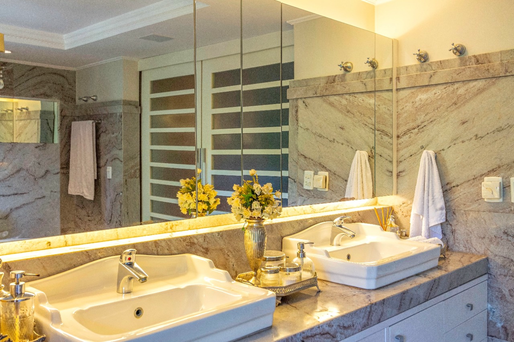 A área íntima do primeiro pavimento dispõe de três suítes, sendo a master composta por closet duplo, banheiro com acabamento em mármore carrara e banheira de design. As duas suítes adicionais oferecem closet e mezanino, garantindo conforto e privacidade.