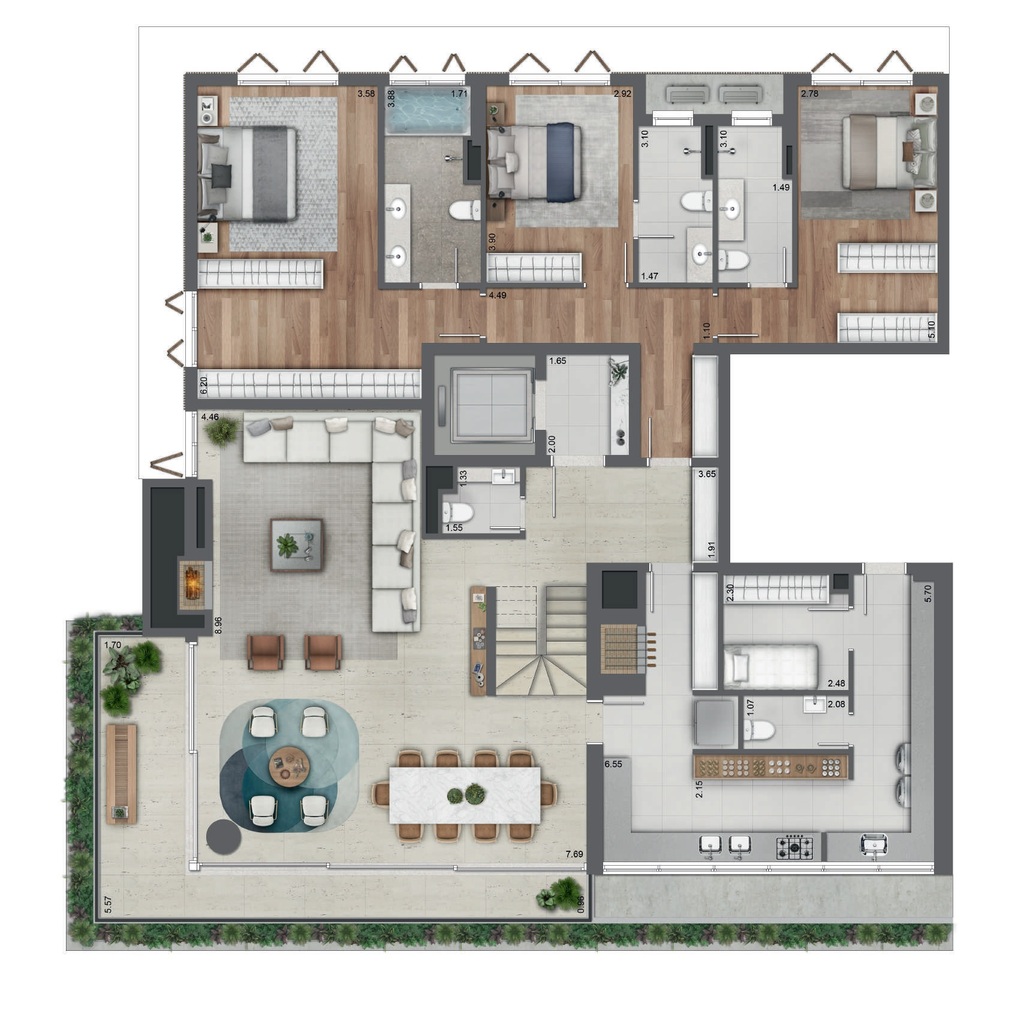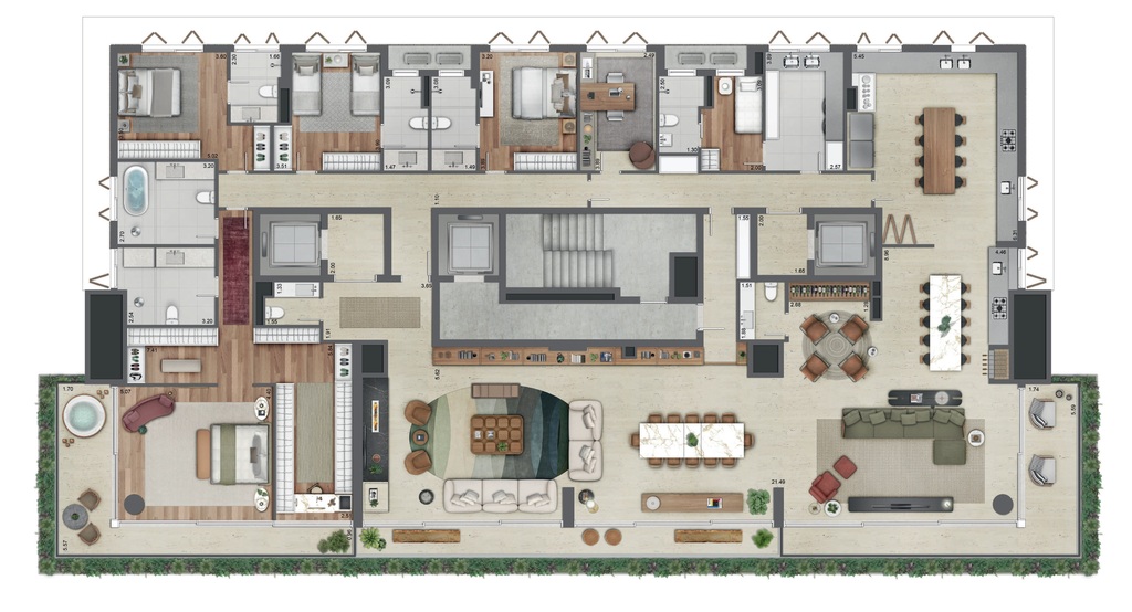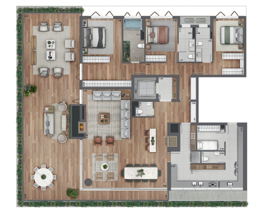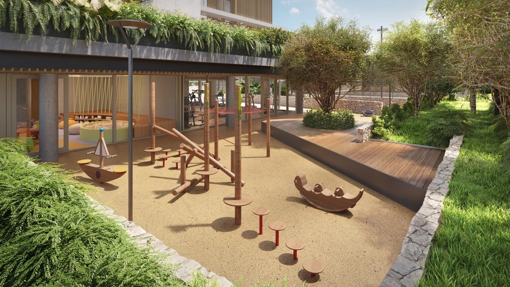 As áreas externas, pensadas sob a óptica da arquitetura contemporânea brasileira junto de conceitos sustentáveis, conversam de forma harmônica com os ambientes internos.