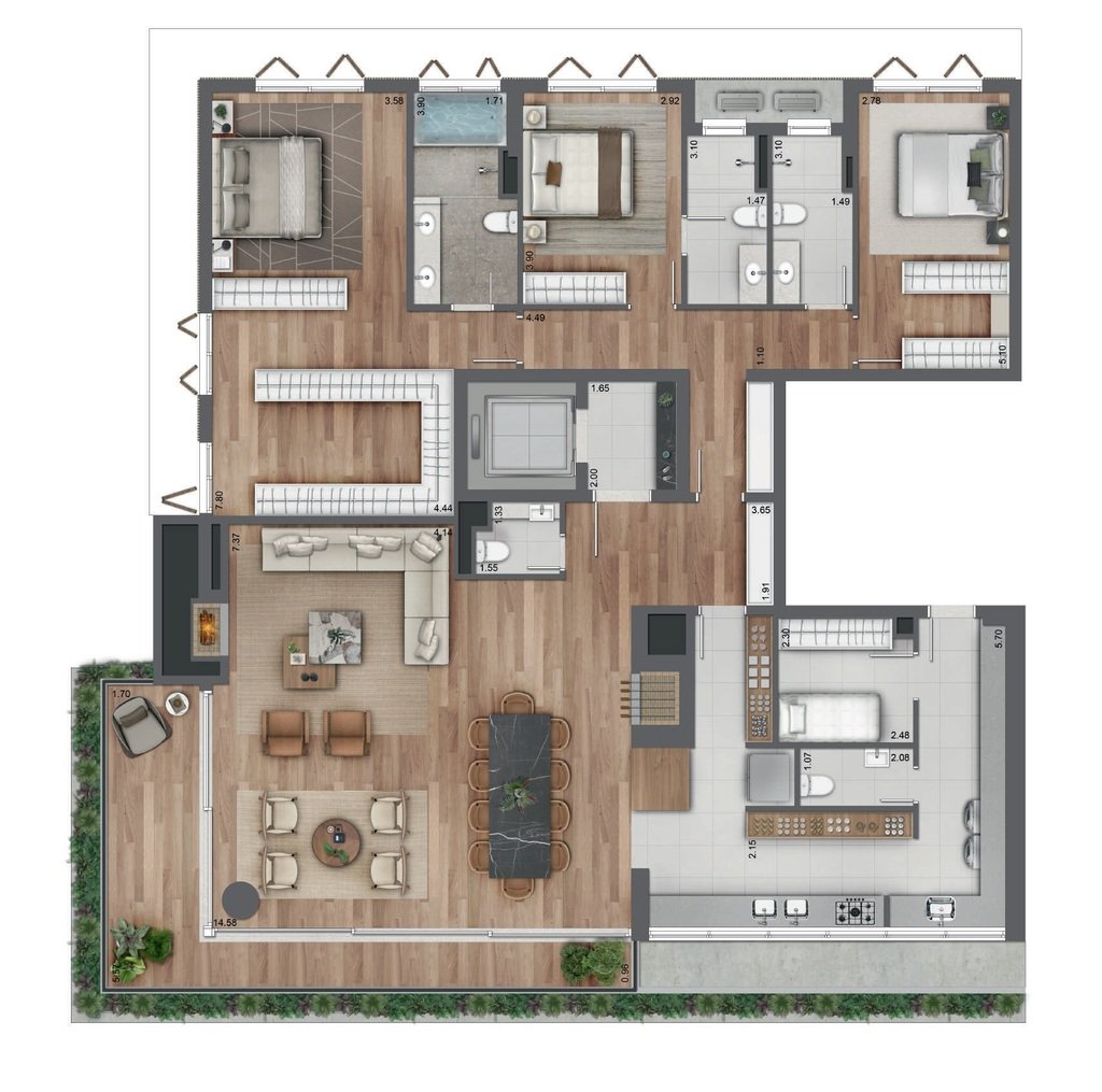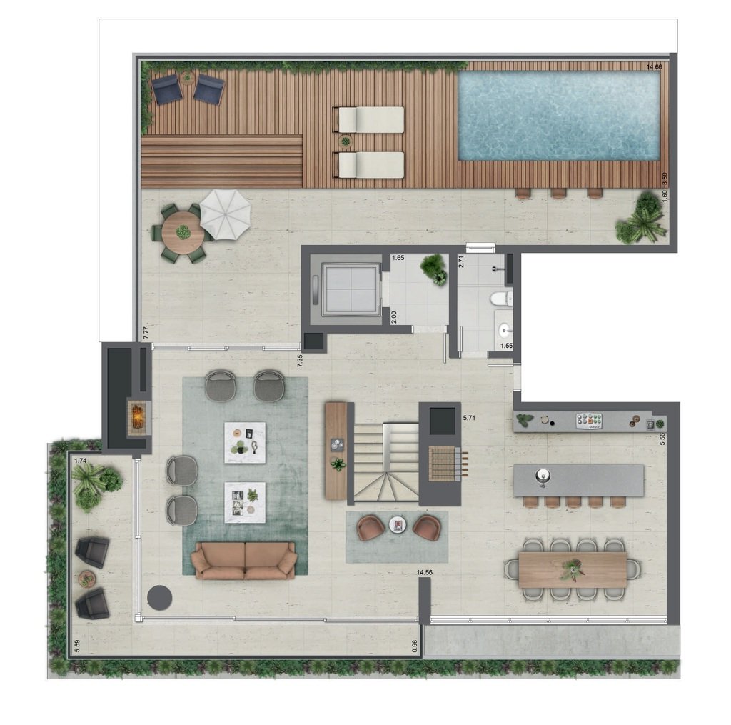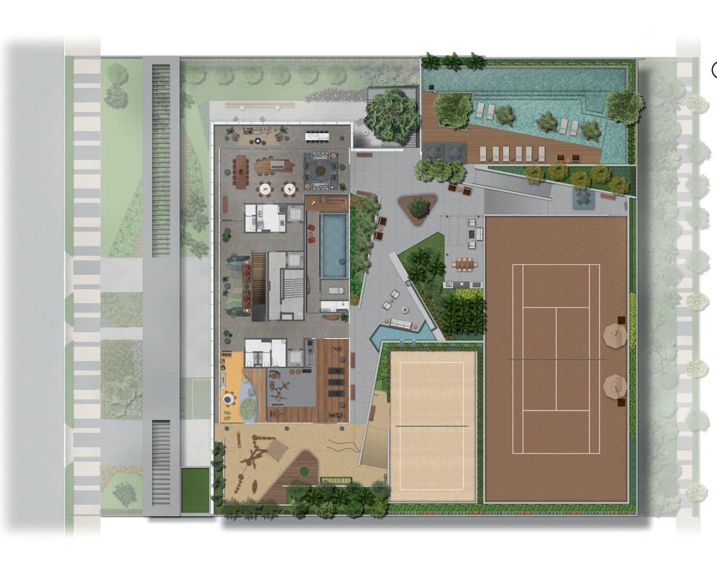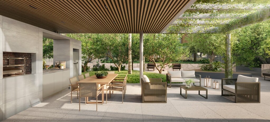 As áreas externas, pensadas sob a óptica da arquitetura contemporânea brasileira junto de conceitos sustentáveis, conversam de forma harmônica com os ambientes internos.