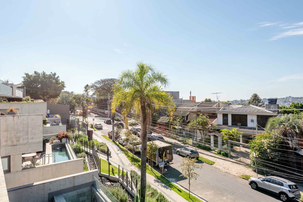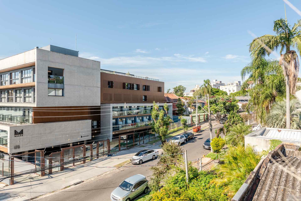 Com fachada contemporânea em concreto aparente, aço corten e madeira, o edifício está localizado a poucos metros do Colégio Farroupilha e das principais conveniências da região.