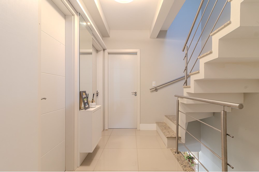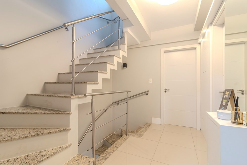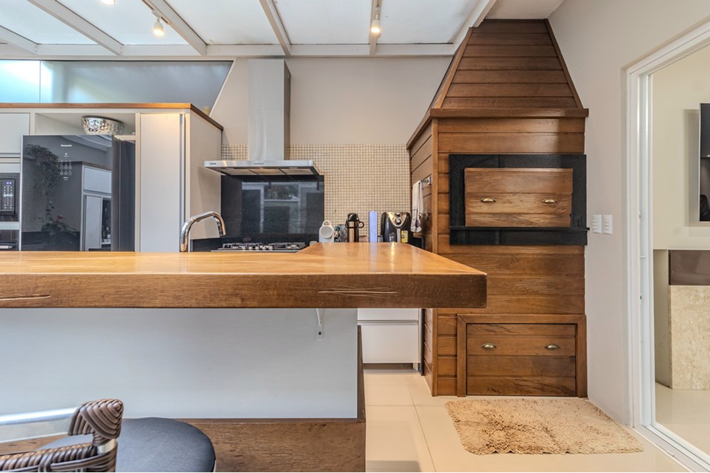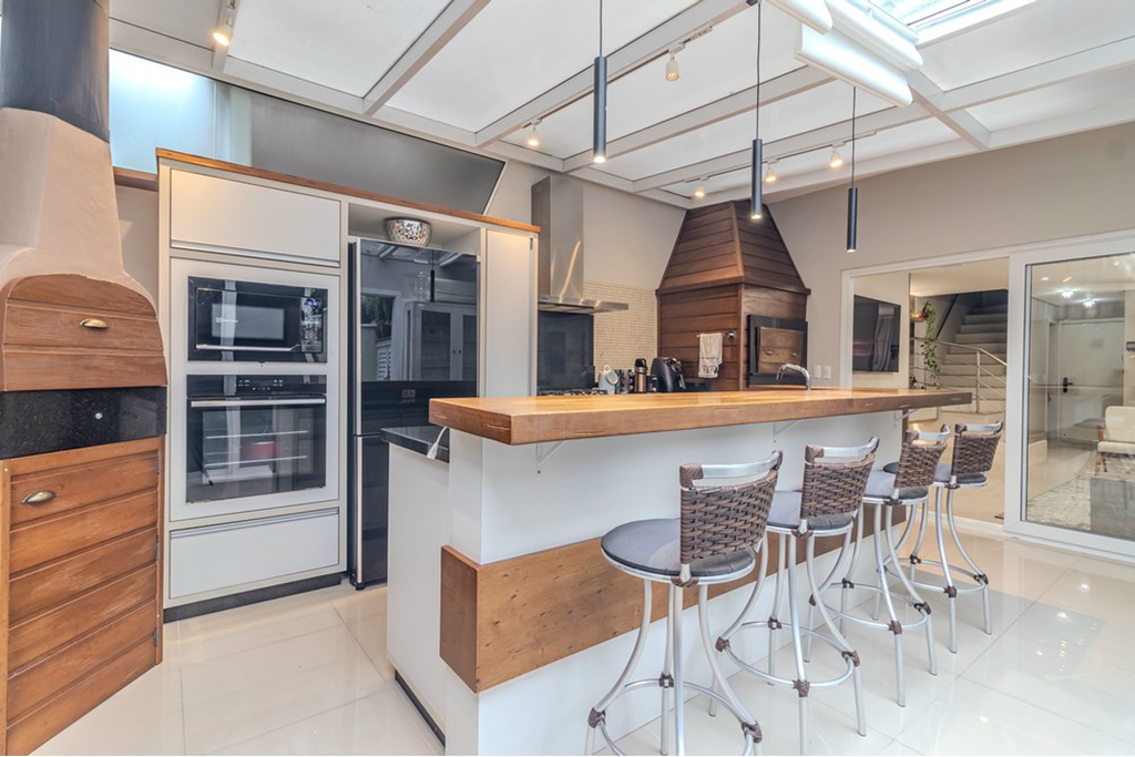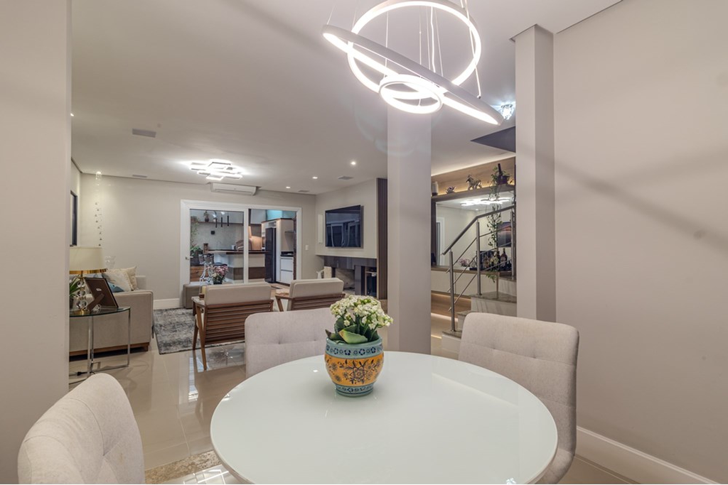 Possui quatro dormitórios, sendo duas suítes, além de duas vagas de garagem cobertas. No primeiro pavimento dispõe de sala ampla para dois ambientes com lareira em granito, lavabo e espaço gourmet com churrasqueira, forno de pizza em concreto e ilha com bancada em granito.