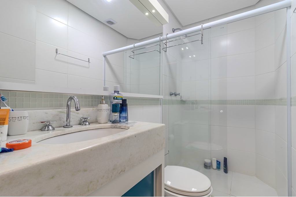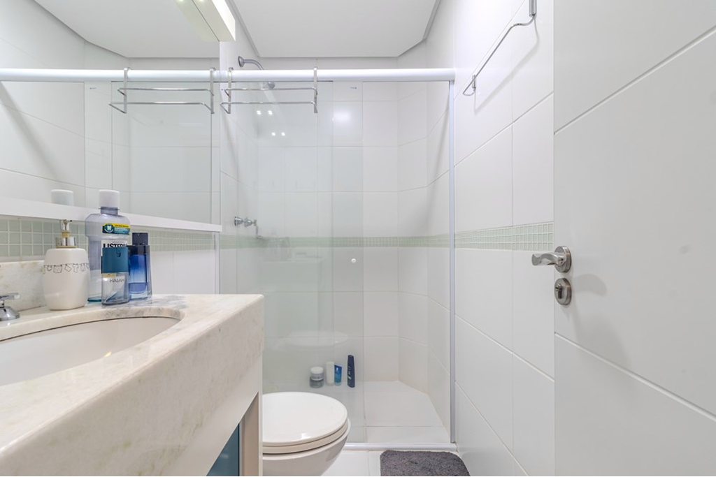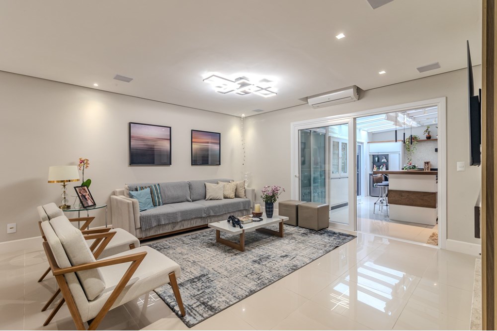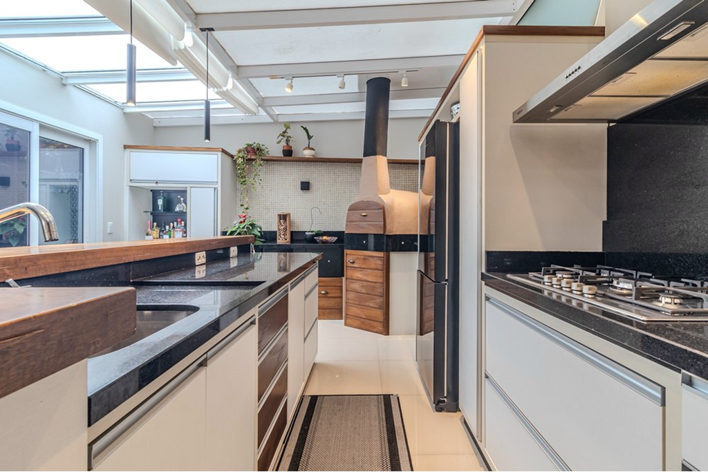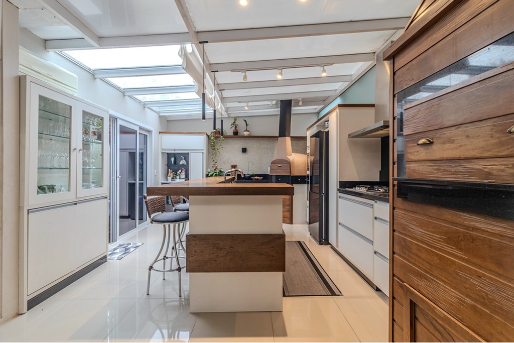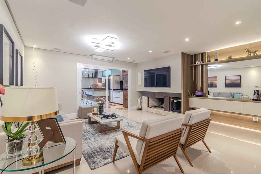 Possui quatro dormitórios, sendo duas suítes, além de duas vagas de garagem cobertas. No primeiro pavimento dispõe de sala ampla para dois ambientes com lareira em granito, lavabo e espaço gourmet com churrasqueira, forno de pizza em concreto e ilha com bancada em granito.