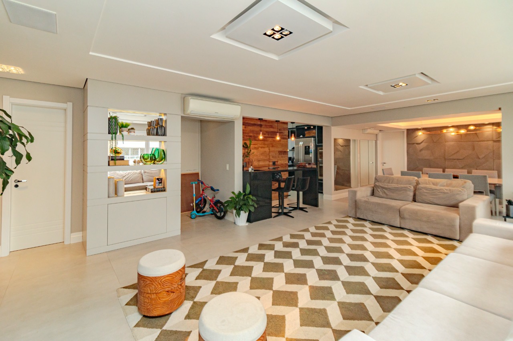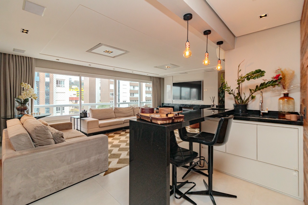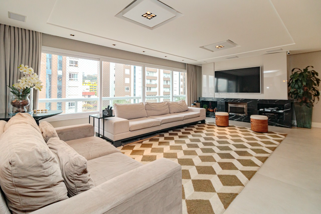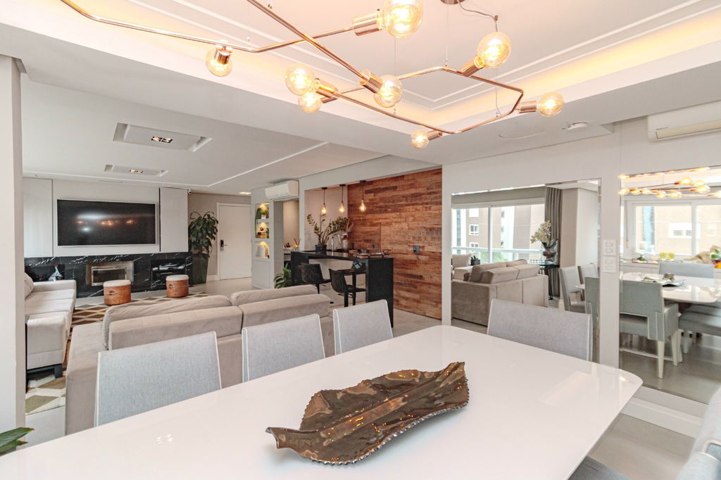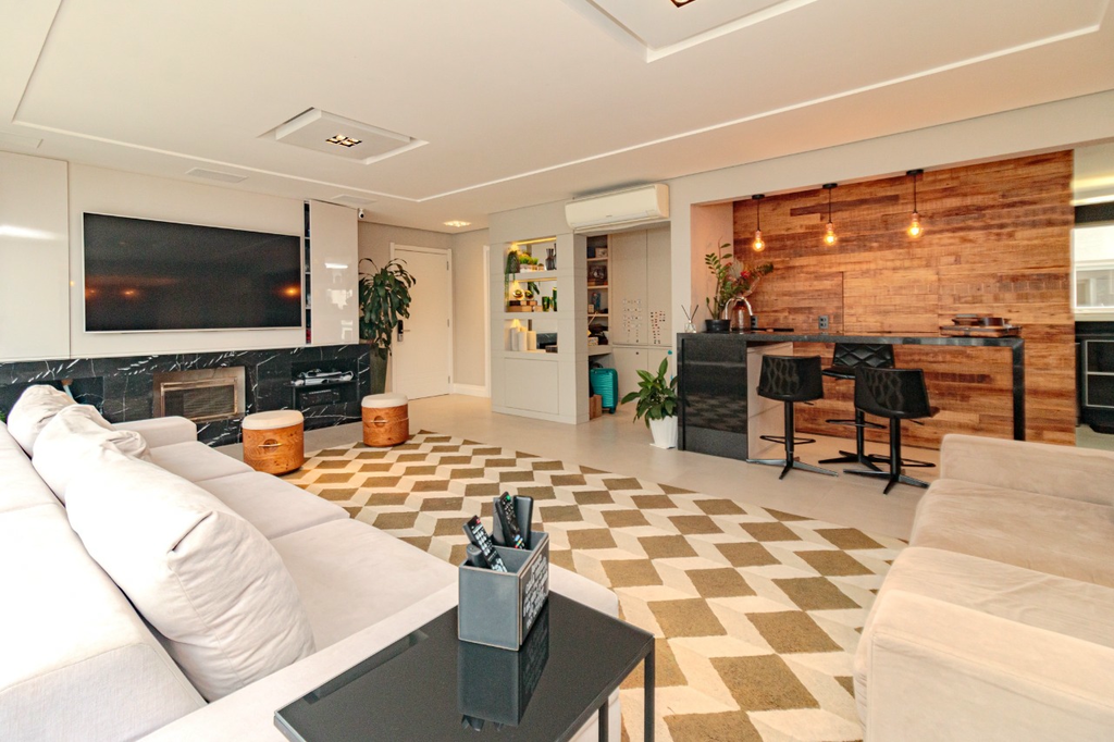 O living é amplo e integrado, com lareira e churrasqueira com bancada, proporcionando um ambiente perfeito para receber convidados com charme e aconchego.
