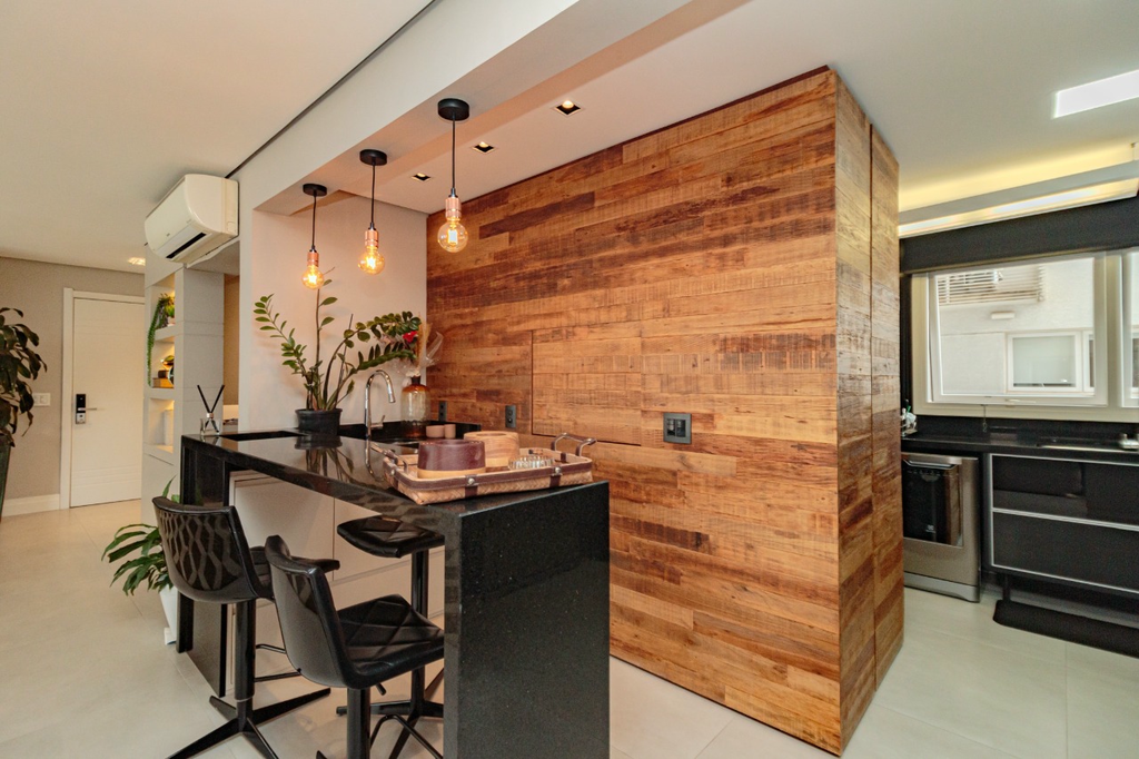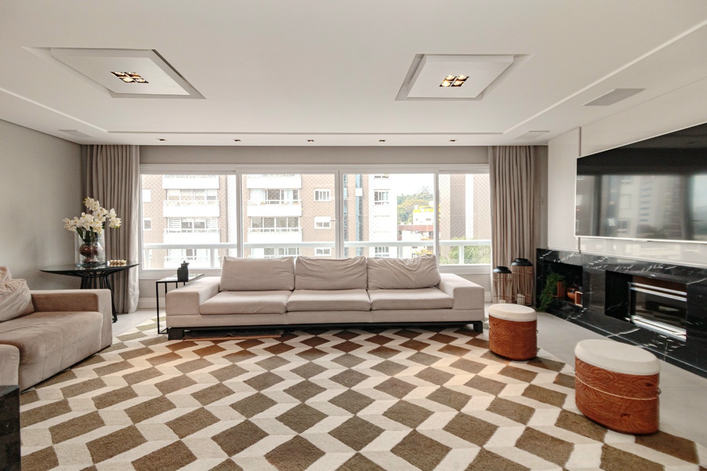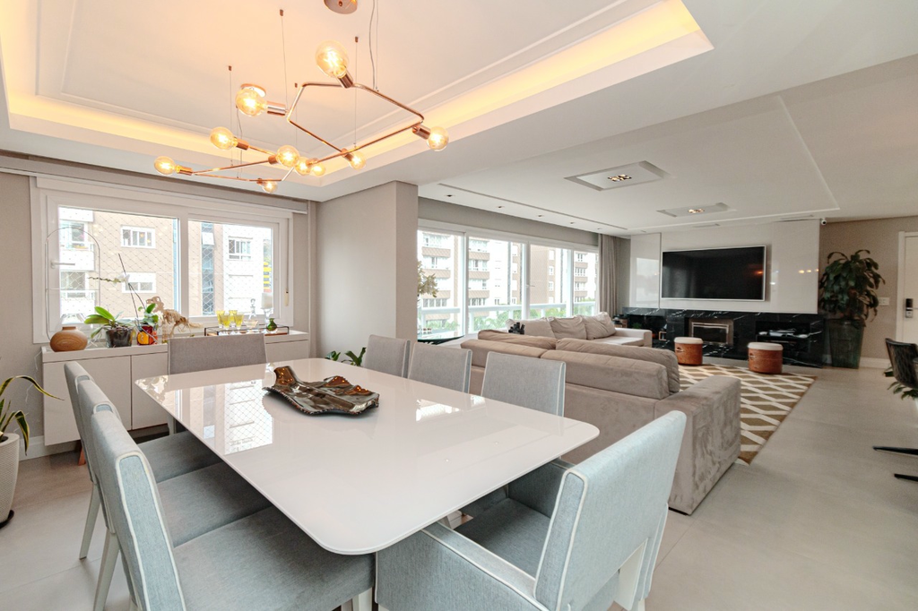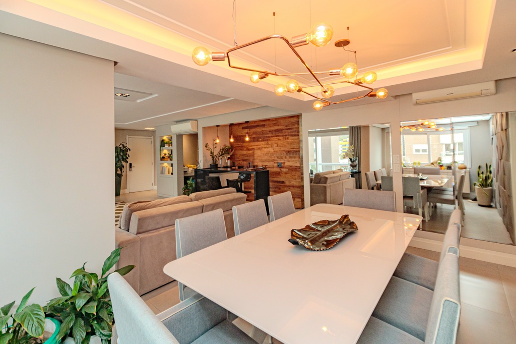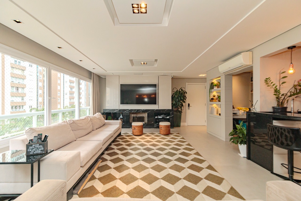 O living é amplo e integrado, com lareira e churrasqueira com bancada, proporcionando um ambiente perfeito para receber convidados com charme e aconchego.