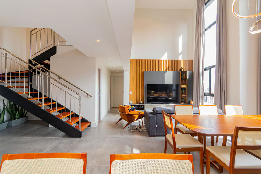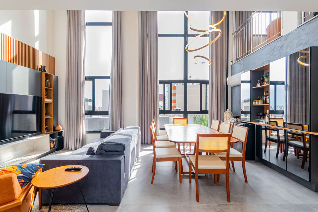 Estar e jantar integrados, mezanino configurado como bar e estar íntimo.