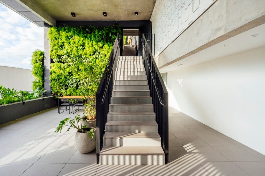 O empreendimento foi pensado como uma extensão da cidade o percurso inicia na calçada e continua por escadas e praças abertas e ensolaradas até a porta do seu apartamento.
