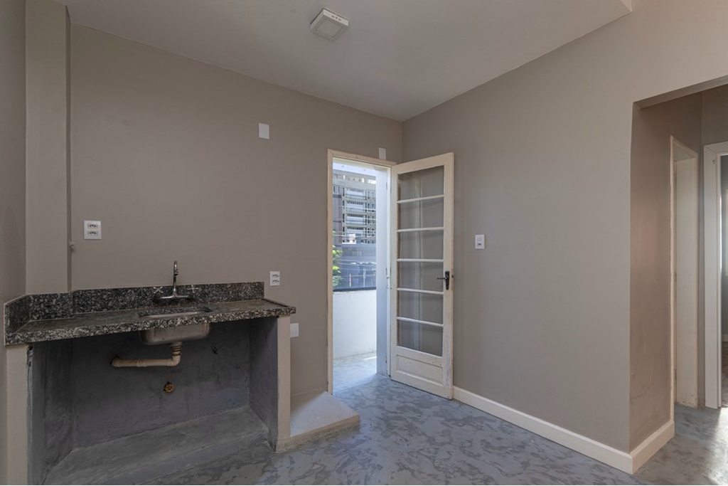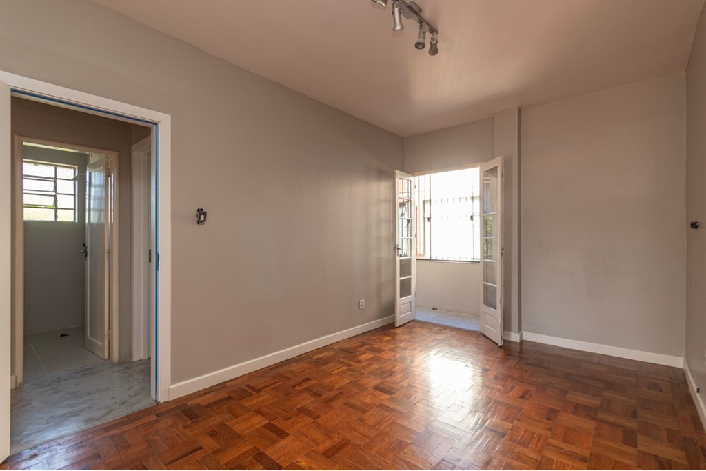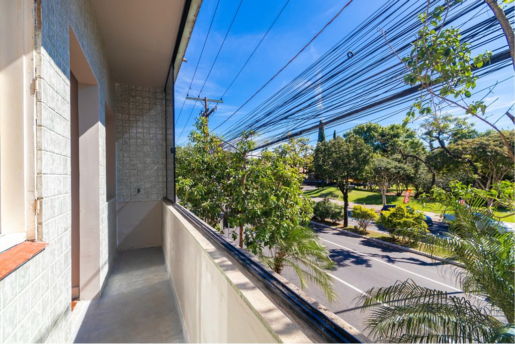 O imóvel conta com 2 banheiros, área de serviço separada, sacada que circunda todo o apartamento com vidros duplos que oferecem isolamento térmico e acústico, piso em parquet em excelente estado e posição de esquina com vista livre para duas ruas e um parque.
