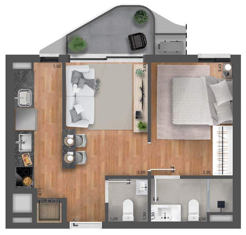 Mas é nas alturas que o maior destaque do projeto se descortina: um rooftop com piscina de borda infinita, conectado a um living de arquitetura com design brasileiro, convidam a uma nova intensidade de contemplação e admiração. Para o pôr do sol mais belo, um mirante de prestígio.