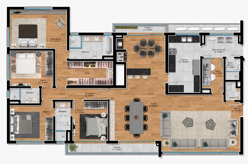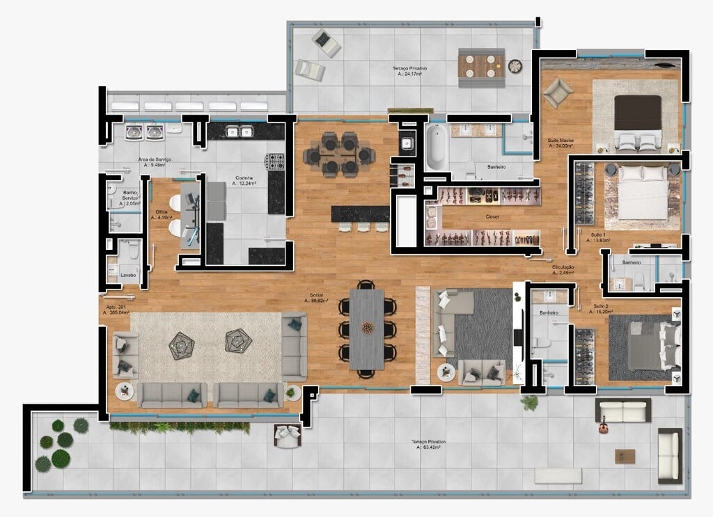 O empreendimento conta apartamentos de 217 m² privativos, com hall privativo, gerador condominial, infraestrutura completa, com quadra de beach tenis, piscina adulto e infantil, salão de festas, fitness, spa, portaria 24 horas com guarita blindada e o padrão de acabamento refinado da DURAFA.