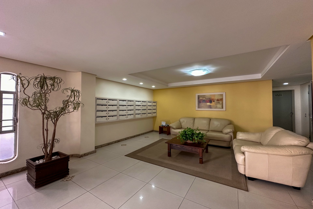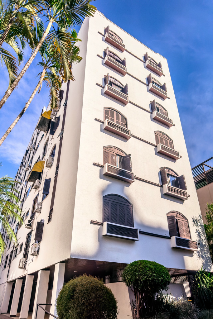 Edifício em centro de terreno, recuado, ajardinado, com 2 elevadores, zelador, salão de festas, churrasqueira.