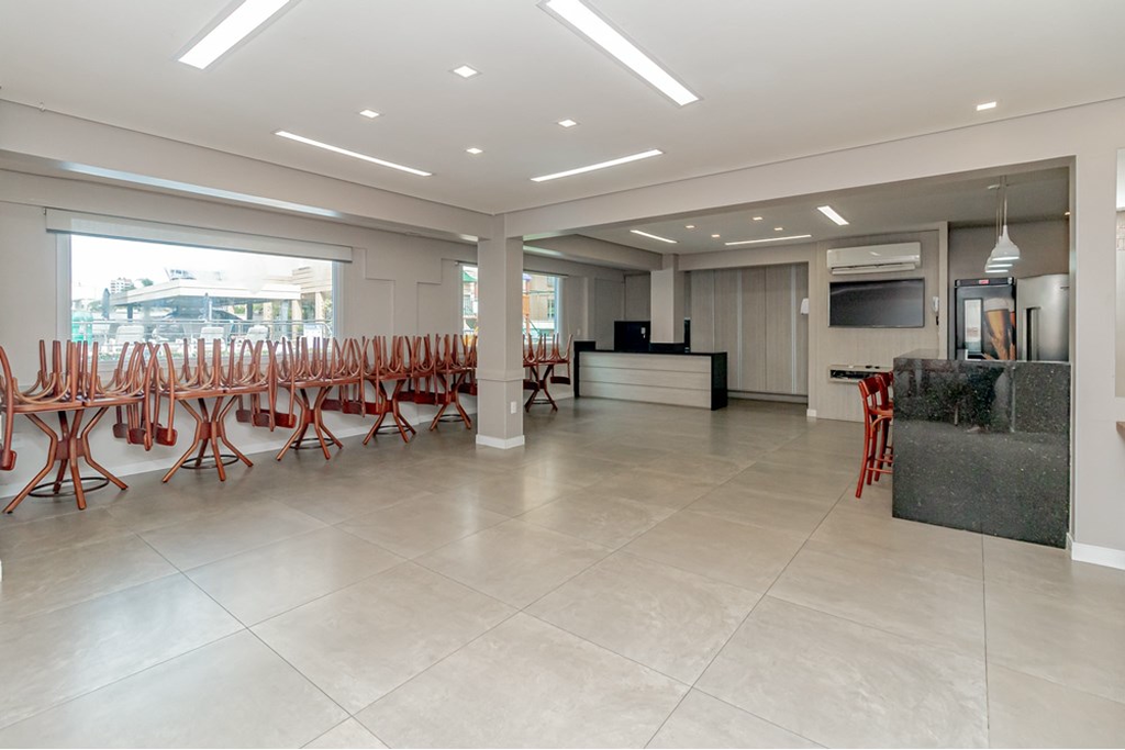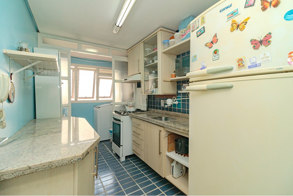 Apartamento com 84m² privativos, três dormitórios, sendo uma suíte, dois banheiros, sacada com lareira, living para dois ambientes, cozinha ampla, área de serviço com sol da tarde.